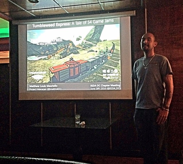 Recently the team and I visited our project’s “alma matar”, the DC Chapter of the International Game Developers Association (IGDA), and gave a presentation on what it was like to develop Tumbleweed Express over the course of 54 Game Jams. The presentation, available on SlideShare, was high-level and designed to provide the audience with an overview of the many events that occurred during the project’s 4.5 year history; I dare to say that the presentation went fairly well.